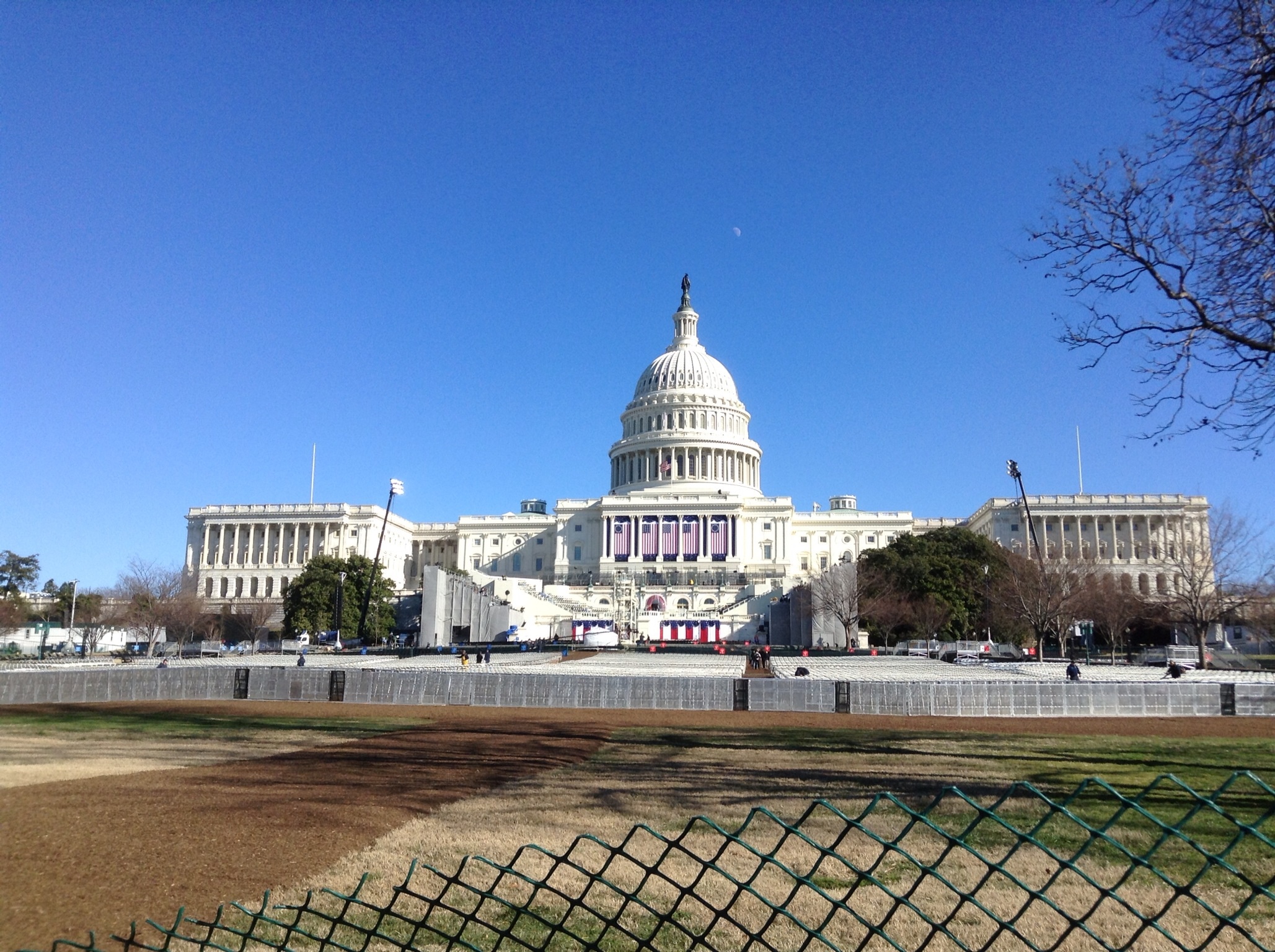 This is the view of the Capitol on Saturday. The white chairs are for the blue and red sections. The grassy area is the orange and green standing area.  I am in the orange area. This section also runs along the sides.