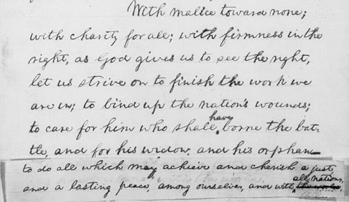 With malice toward none; with charity for all; with firmness in the right, as God gives us to see the right, let us strive on to finish the work we are in; to bind up the nation’s wounds; to care for him who shall have borne the battle, and for his widow, and his orphan – to do all which may achieve and cherish a just, and a lasting peace, among ourselves, and with all nations.